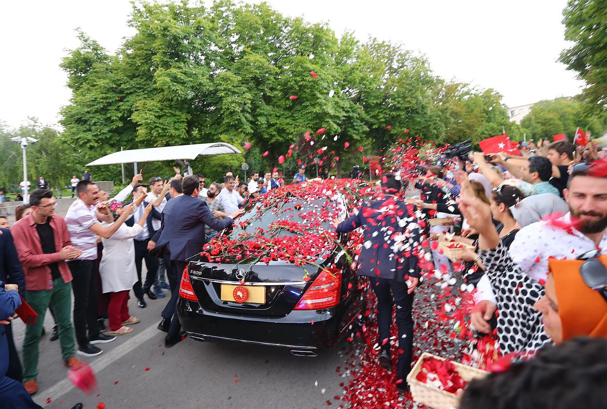 Cumhurbaşkanlığı Hükümet Sistemi'nin ilk Cumhurbaşkanı Recep Tayyip Erdoğan, yemin etmek üzere geldiği Türkiye Büyük Millet Meclisinin (TBMM) Çankaya girişinde vatandaşlar tarafından güllerle karşılandı.