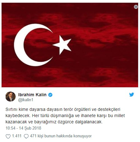 Paylaşımında Türk bayrağı fotoğrafına yer veren Kalın, "Sırtını kime dayarsa dayasın terör örgütleri ve destekçileri kaybedecek. Her türlü düşmanlığa ve ihanete karşı bu millet kazanacak ve bayrağımız özgürce dalgalanacak." dedi.