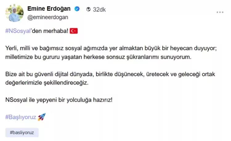 "NSosyal'den merhaba. Yerli, milli ve bağımsız sosyal ağımızda yer almaktan büyük bir heyecan duyuyor; milletimize bu gururu yaşatan herkese sonsuz şükranlarımı sunuyorum. Bize ait bu güvenli dijital dünyada, birlikte düşünecek, üretecek ve geleceği ortak değerlerimizle şekillendireceğiz. NSosyal ile yepyeni bir yolculuğa hazırız."