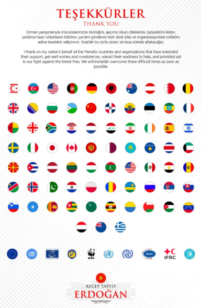 "Orman yangınlarıyla mücadelemizde desteğini, geçmiş olsun dileklerini, taziyelerini ileten, yardıma hazır olduklarını bildiren, yardım gönderen tüm dost ülke ve organizasyonlara milletim adına teşekkür ediyorum.