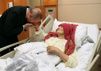 100 yaşındaki Nazmiye Balcı'nın elini öpen Cumhurbaşkanı Erdoğan, şifa dileklerini iletti.