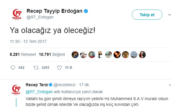 İşte Erdoğan'ın burada yaptığı konuşmada kullandığı ''Ya olacağız ya öleceğiz!'' ifadesi ilerleyen saatlerde Cumhurbaşkanı Erdoğan'ın resmi twitter hesabından da tweet olarak paylaşıldı.