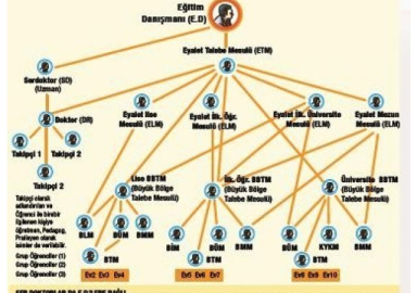 Şemayla ilgili diğer detaylar şu şekilde: Eğitim Danışmanları'nın altında Eyalet Talebe Mesulleri (ETM) bulunuyor. Eyalet Lise Mesulleri (ELM), Eyalet İlköğretim Mesulleri (EİM), Eyalet Üniversite Mesulleri (EÜM) ve Eyalet Mezun Mesulleri (EMM) sadece Eyalet Talebe Mesulleri'ne bağlı faaliyet yürütüyor.
