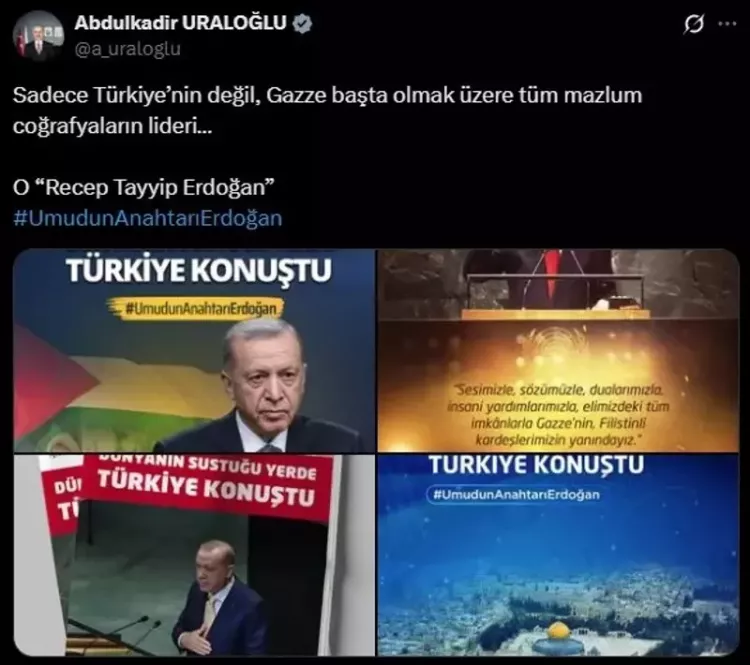 Birleşmiş Milletler 80. Genel Kurulu'nda yaptığı konuşmada bir kez daha mazlumların sesi olan, Gazze'deki Filistinlilerin uğradığı soykırımı dünyaya haykıran Başkan Erdoğan'ın bu çabaları sosyal medyada da gündem oldu.