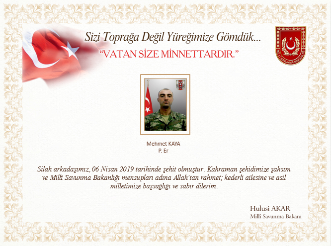 Yapılan açıklamada, şehit için Allah'tan rahmet, kederli ailesine, Türk Silahlı Kuvvetleri (TSK) ile Türk milletine başsağlığı dilekleri de ifade yer aldı.