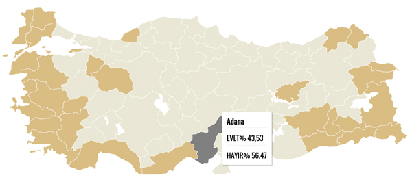 Referandum sonuçları netleşmeye başladı. Referandum sonuçlarında büyük sürprizi Adana yaptı. Adana referandumda hayır diyerek tarihinde görülememiş bir sonuca imza attı.