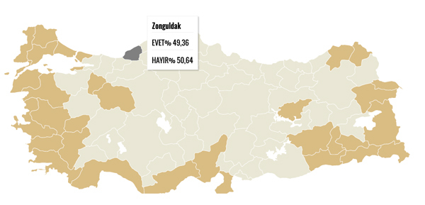 Öte yandan Karadeniz'de sürpriz yapan ilk Zonguldak oldu. Karadeniz'de Zonguldak seçim sonuçlarına göre, Zonguldak'tan saat 18.50 itibariyle yüzde 50 hayır, yüzde 49 evet oyları görünüyor.