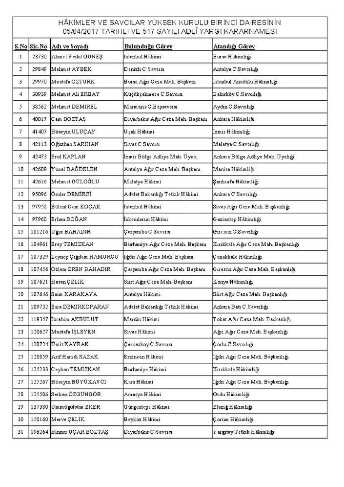 Kararname ile 31 hakim ve savcının görev yeri değişti.