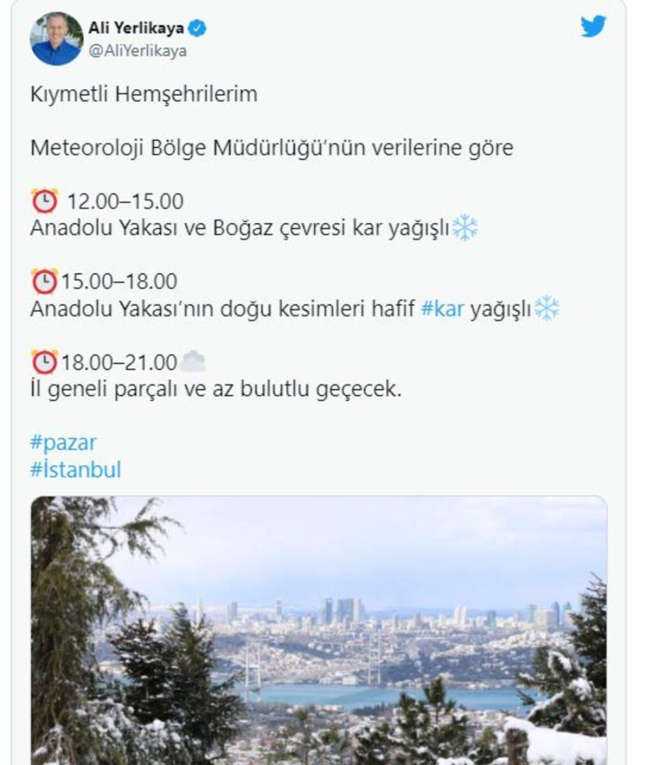 Vali Yerlikaya, "Meteoroloji Bölge Müdürlüğünün verilerine göre 12.00-15.00 Anadolu Yakası ve Boğaz çevresi kar yağışlı, 15.00-18.00 Anadolu Yakası'nın doğu kesimleri hafif kar yağışlı, 18.00-21.00 il geneli parçalı ve az bulutlu geçecek." ifadesini kullandı.