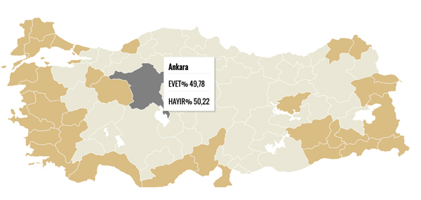 Ankara'da ise yarışın başında evet oyları açık farkla önde giderken seçim sonuçlarının netleşmeye başlamasıyla durum tersine döndü. Ankara'da saat 19.30 itibariyle hayır oyları yüzde 50.22'ye yükseldi, evet oyları ise yüzde 49.78 oldu.