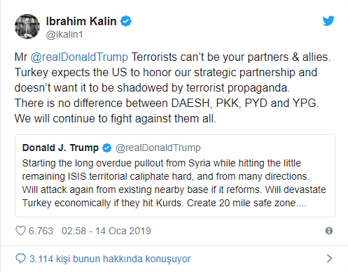 "Sayın Trump, teröristler sizin müttefikiniz olamaz" diyen İbrahim Kalın, Türkiye'nin, ABD'nin stratejik ittifaka uygun davranmasını ve bu ittifakın terör propagandası tarafından gölgelenmemesini beklediğini kaydetti. DAEŞ, PKK, PYD ve YPG arasında fark olmadığını ifade eden İbrahim Kalın, Türkiye'nin tüm bu örgütlere karşı savaşmaya devam edeceğini de söyledi.