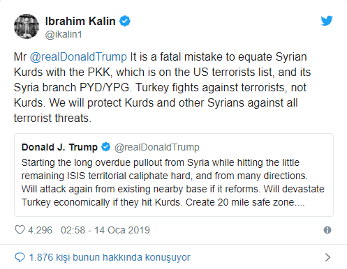 Bu açıklamadan sonra Cumhurbaşkanlığı Sözcüsü İbrahim Kalın, ABD Başkanı'ın bu sözlerine yanıt verdi. "Suriyeli Kürtleri, ABD'nin terör listesinde bulunan PKK ve onun Suriye kolu PYD ile eş tutmak ölümcül bir hatadır" şeklinde konuştu.