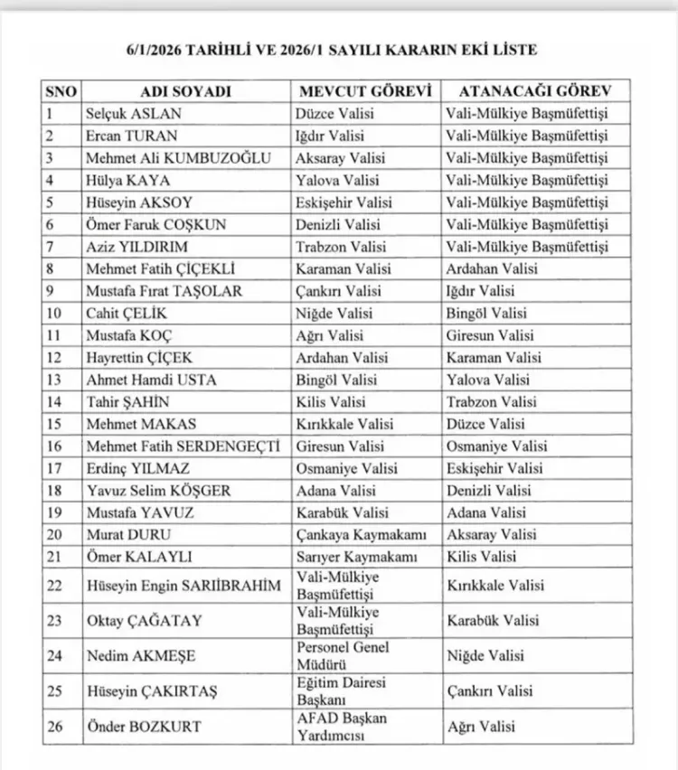 Cumhurbaşkanı Recep Tayyip Erdoğan'ın imzası ile yayımlanan karar ile birlikte, Düzce Valisi Selçuk Arslan, Iğdır Valisi Ercan Turan, Aksaray Valisi Mehmet Ali Kumbuzoğlu, Yalova Valisi Hülya Kaya, Eskişehir Valisi Hüseyin Aksoy, Denizli Valisi Ömer Faruk Çoşkun ve Trabzon Valisi Aziz Yıldırım Vali-Mülkiye Başmüfettişliği'ne getirildi. Ayrıca Karaman Valisi Mehmet Fatih Çiçekli Ardahan Valiliği'ne, Çankırı Valisi Mustafa Fırat Taşolar Iğdır Valiliği'ne, Niğde Valisi Cahit Çelik Bingöl Valiliği'ne, Ağrı Valisi Mustafa Koç Giresun Valiliği'ne, Ardahan Valisi Hayrettin Çiçek Karaman Valiliği'ne, Bingöl Valisi Ahmet Hamdi Usta Yalova Valiliği'ne, Kilis Valisi Tamer Şahin Trabzon Valiliği'ne, Kırıkkale Valisi Mehmet Makas Düzce Valiliği'ne, Giresun Valisi Mehmet Fatih Serdengeçti Osmaniye Valiliği'ne, Osmaniye Valisi Erdinç Yılmaz Eskişehir Valiliği'ne, Adana Valisi Yavuz Selim Köşger Denizli Valiliği'ne, Karabük Valisi Mustafa Yavuz Adana Valiliği'ne, Çankaya Kaymakamı Murat Duru Aksaray Valiliği'ne ve Sarıyer Kaymakamı Ömer Kalaylı Kilis Valiliği'ne atandı. Vali-Mülkiye Başmüfettişleri Hüseyin Engin Sarıibrahim Kırıkkale Valiliği'ne ve Oktay Çağatay Karabük Valiliği'ne, İçişleri Bakanlığı Personel Genel Müdürü Nedim Akmeşe Niğde Valiliği'ne, Eğitim Dairesi Başkanı Hüseyin Çakırtaş Çankırı Valiliği'ne ve AFAD Başkan Yardımcısı Önder Bozkurt Ağrı Valiliği'ne atandı.