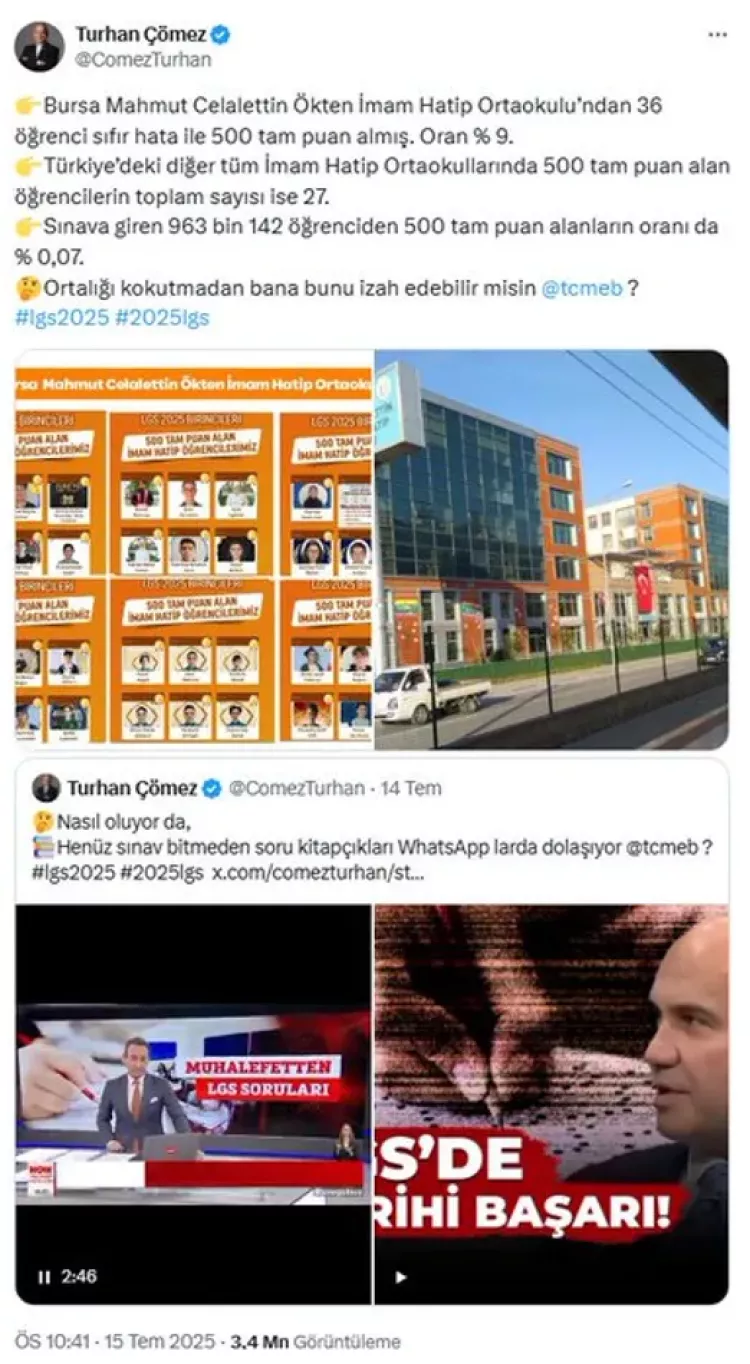 Kuyuya taşı atan İYİ Parti Grup Başkanvekili Turhan Çömez oldu. Çömez, Bursa Mahmut Celalettin Ökten İmam Hatip Ortaokulu’ndan 36 öğrencinin 500 tam puan aldığını iddia etti. İddiası çarpıcıydı: “Türkiye’deki diğer tüm imam hatiplerde sadece 27 öğrenci tam puan alırken, bu okulda %9’luk bir oran! Bu koku değil, kokuşmuşluk!” Antalya ve Trabzon’daki aynı adlı okullardan da toplam 46 tam puan çıktığını öne sürdü. Çömez’in paylaşımı, 14 yaşındaki çocukların isim ve fotoğraflarıyla birlikte 8 milyon kez görüntülendi.