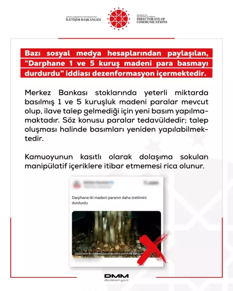 Dezenformasyonla Mücadele Merkezi (DMM) tarafından yapılan açıklamada, Türkiye Cumhuriyet Merkez Bankası stoklarında yeterli miktarda basılmış 1 ve 5 kuruşluk madeni para bulunduğu belirtilerek, ilave talep gelmediği için yeni basım yapılmadığı ifade edildi. Söz konusu madeni paraların tedavülde olduğu vurgulanırken, ihtiyaç oluşması halinde basımlarının yeniden gerçekleştirilebileceği kaydedildi.