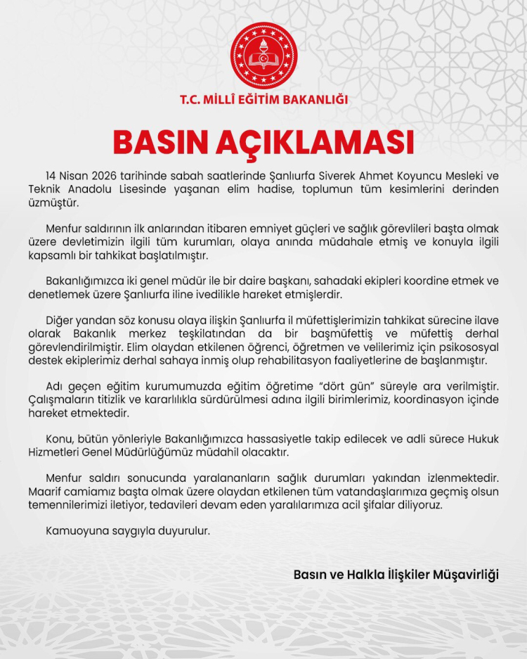 Bakanlıktan yapılan açıklamada, bugün sabah saatlerinde Siverek Ahmet Koyuncu Mesleki ve Teknik Anadolu Lisesinde yaşanan hadisenin toplumun tüm kesimlerini derinden üzdüğü belirtildi.