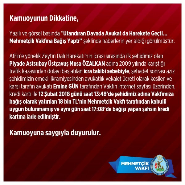 Vakıf ise şu açıklamayı yaptı ve 18 bin liralık tutarın iade edildiğini belirtti: "Yazılı ve görsel basında “Utandıran Davada Avukat da harekete geçti…. Mehmetçik Vakfına Bağış Yaptı” şeklinde haberler yer aldığı görülmüştür. Afrin'e yönelik Zeytin Dalı Harekatı'nın icrası sırasında ilk Şehidimiz olan Piyade Astsubay Üstçavuş Musa ÖZALKAN adına, 2009 yılında karıştığı trafik kazasından dolayı başlatılan icra takibi sebebiyle, şehadet sonrası aziz şehidimizin emekli ikramiyesinden avukatlık vekalet ücreti olarak kesilen ve karşı tarafın avukatı Emine GÜN tarafından vakfın internet sayfası üzerinden, kredi kartından 12 Şubat 2018 günü saat 13:48'de, şehidimiz adına Vakfımıza bağış olarak yatırılan 18 bin TL, Mehmetçik Vakfı tarafından kabulü uygun bulunmamış ve aynı gün saat 17:08'de bağışı yapan şahsın kredi kartına iade edilmiştir."