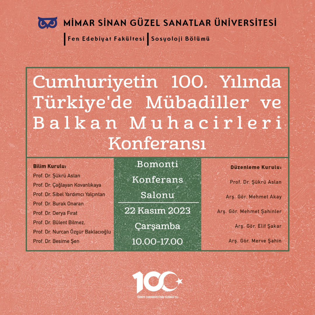 Mimar Sinan Güzel Sanatlar Üniversitesi, Sosyoloji Bölümü 22 Kasım 2023 Çarşamba günü 'Cumhuriyetin 100. Yılında Türkiye'de Mübadiller ve Balkan Muhacirleri' konferansı düzenleyecek.
