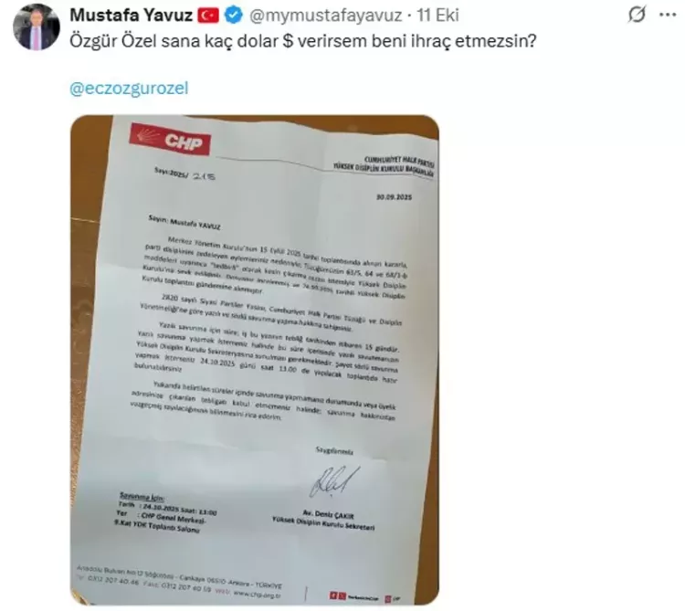 CHP'de yolsuzluğa bulaşan isimler partide korunurken, Kemal Kılıçdaroğlu'na yakın isimler bir bir ihraç ediliyor. CHP'den ihraç edilmek için Yüksek Disiplin Kurulu'na sevk edilen Mustafa Yavuz da sosyal medyada ihraç celbini paylaşıp, "Özgür Özel sana kaç dolar verirsem beni ihraç etmezsin?" notunu düştü.