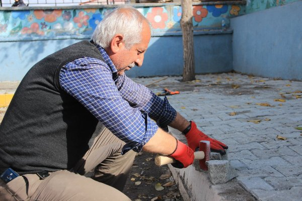 Okulun bahçesinde koruma duvarların yan kısmı kazma ve kürekle kazıldı daha sonra kum serilip üzerine parke döşeme yapılmaya başlandı.