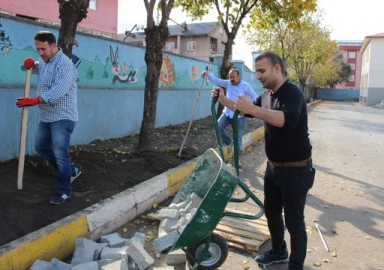 Erzurum’da Şükrüpaşa İlkokulu'nun müdür, müdür yardımcıları ve öğretmenleri ellerine kürek, tırmık ve çekiç alarak okulun çevre düzenlemesini kış şartlarına hazırlamak için işe koyuldu.