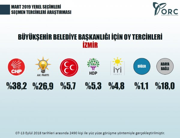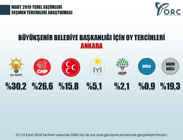 24 Haziran seçimlerinde en yakın tahmini yapan şirketlerden biri olan ORC, İstanbul, Ankara, İzmir, Bursa ve Adana'yı kapsayan yerel seçim anketinin sonuçlarını kamuoyu ile paylaştı.