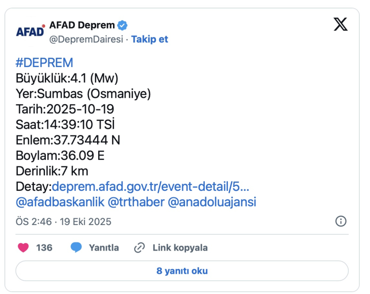Afet ve Acil Durum Yönetimi Başkanlığı (AFAD), Osmaniye'nin Sumbas ilçesinde 4.1 büyüklüğünde bir depremin meydana geldiğini duyurdu.