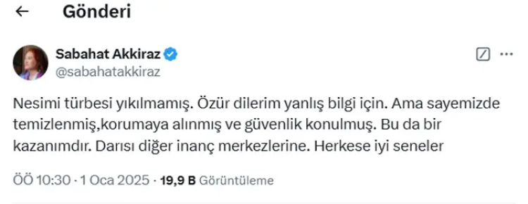 Sabahat Akkiraz, günler sonra özür dileyerek, "Nesimi türbesi yıkılmamış. Özür dilerim yanlış bilgi için." dedi.