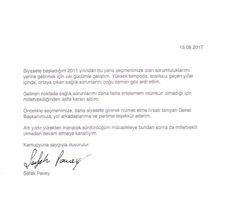 CHP İstanbul Milletvekili Şafak Pavey milletvekilliğinden istifa etti. Pavey yaptığı basın açıklamasında istifasına gerekçe olarak sağlık sorunlarını gösterdi.