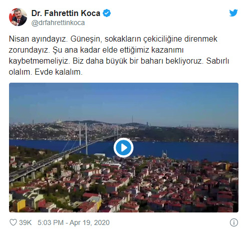 Sağlık Bakanı Fahrettin Koca, Twitter'dan corona virüs salgınıyla ilgili paylaşımda bulundu.
