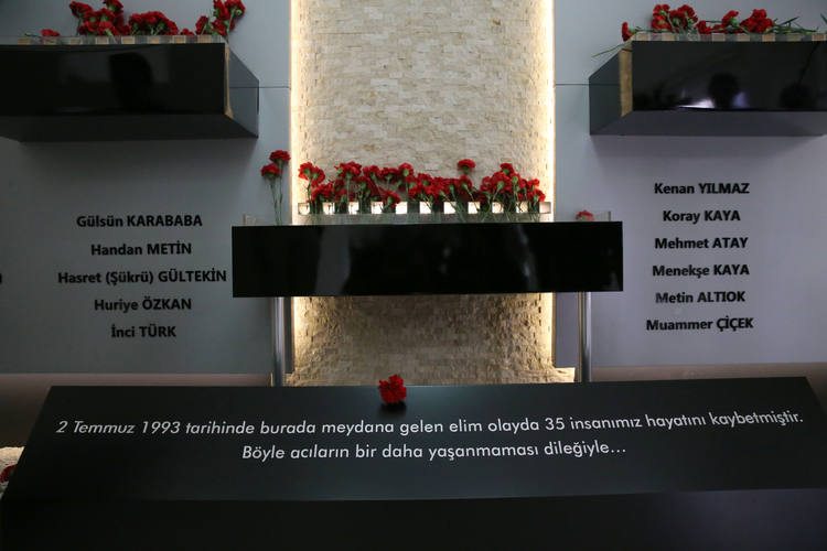Sivas Valisi Yılmaz Şimşek ve beraberindekiler, kentte 2 Temmuz 1993'te çıkan olaylarda hayatını kaybedenler için eski Madımak Oteli binasında oluşturulan anı köşesine karanfil bıraktı.