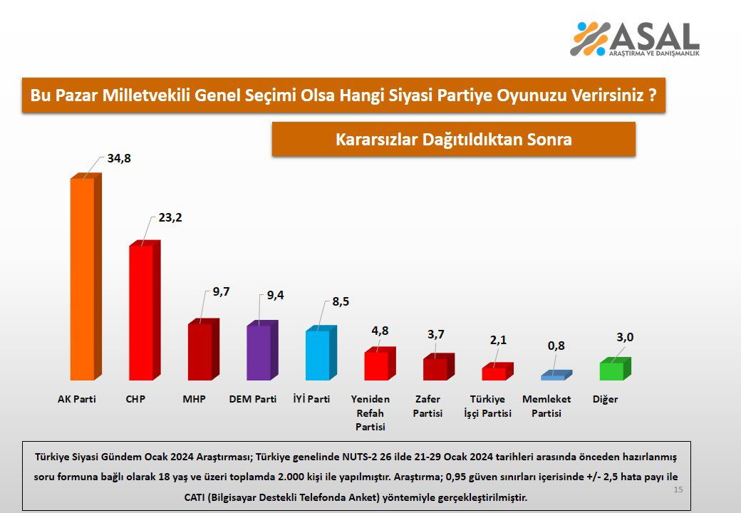 Ankette AK Parti 34.8 puan ile ilk sırada yer alırken, CHP yüzde 23.2 ile ikinci, MHP yüzde 9.7 ile üçüncü oldu. ASAL anketinde DEM Parti yüzde 9.4, İYİ Parti yüzde 8.5 çıktı.