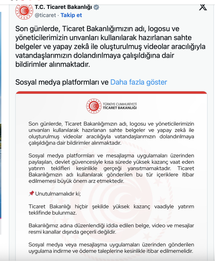 Bakanlık tarafından yapılan açıklamada, son günlerde sahte belge ve videolarla gerçekleştirilen dolandırıcılık girişimlerine dair bildirimlerin arttığı ifade edildi. Açıklamada, “Ticaret Bakanlığımızın adı, logosu ve yöneticilerimizin unvanları kullanılarak hazırlanan sahte belgeler ve yapay zekâ ile oluşturulmuş videolar aracılığıyla vatandaşlarımızın dolandırılmaya çalışıldığına dair bildirimler alınmaktadır” denildi.