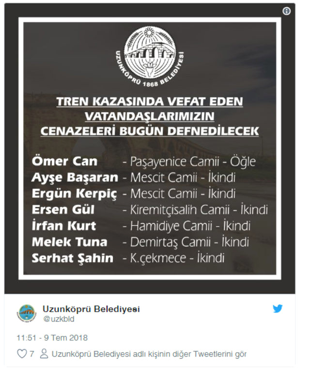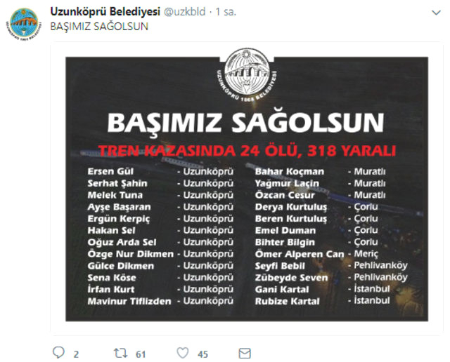 Kazada yaşamını yitiren 24 vatandaşın kimliği Uzunköprü Belediyesi tarafından açıklandı. Uzunköprü Belediyesi'nin resmi hesabından yapılan açıklamada yaşamını yitiren 24 kişinin isimleri açıklandı.