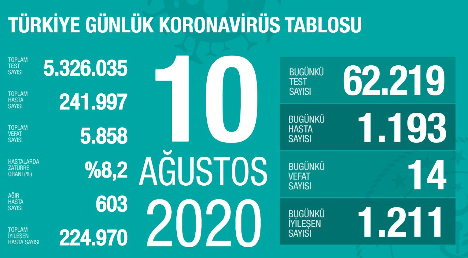 Sağlık Bakanı Fahrettin Koca 10 Ağustos 2020 günlük corona virüs tablosunu açıkladı. Türkiye'de corona virüs nedeniyle son 24 saatte 14 kişi hayatını kaybetti, bin 193 yeni vaka tespit edildi.