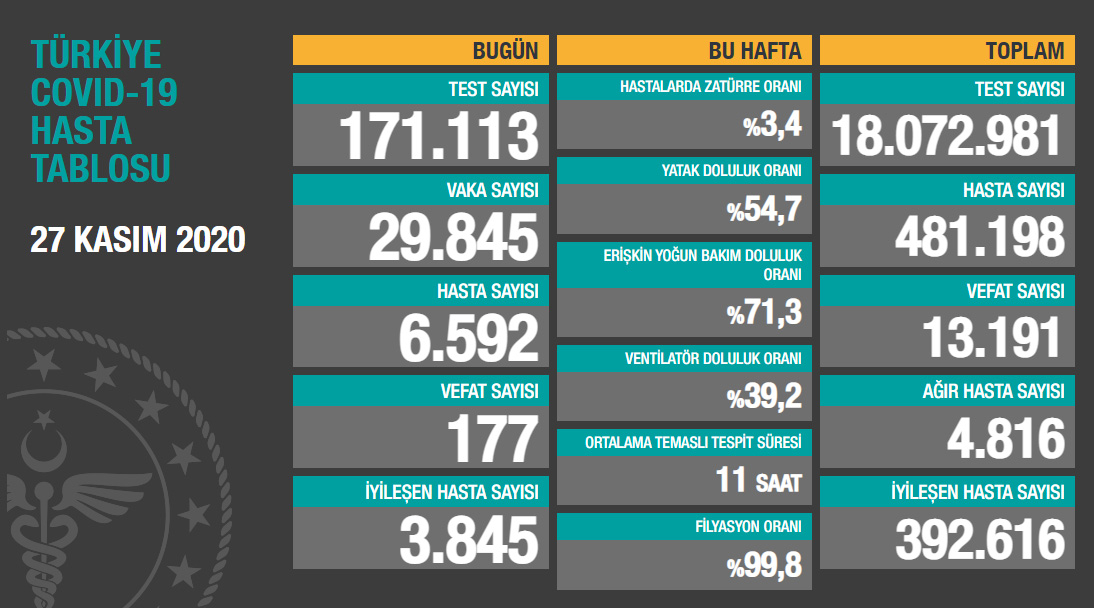 Türkiye'de corona virüsten son 24 saatte 177 can kaybı, 29 bin 845 yeni vaka 27 Kasım 2020