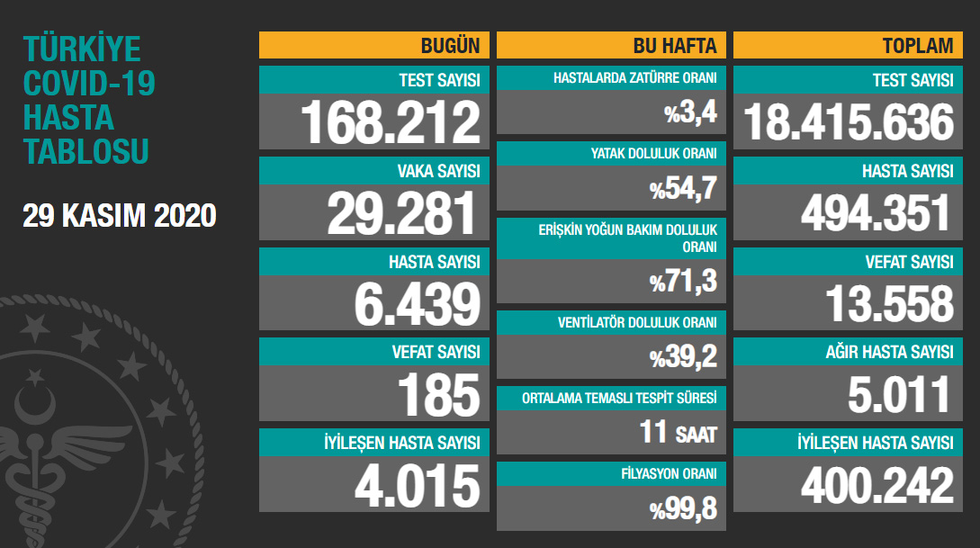 Türkiye'de corona virüsten son 24 saatte 185 can kaybı, 29 bin 281 vaka 29 Kasım 2020