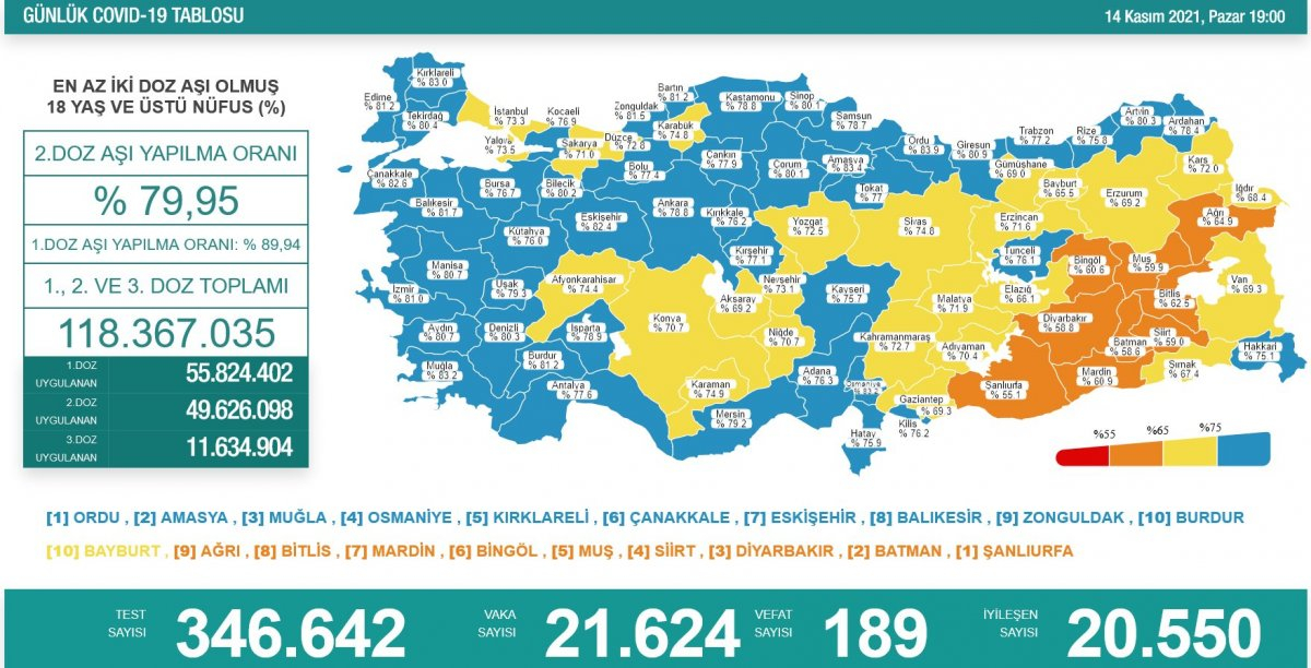 18 yaş üstünde en az iki doz aşı yaptıranların oranının en yüksek olduğu 10 il Ordu, Amasya, Muğla, Osmaniye, Kırklareli, Çanakkale, Eskişehir, Balıkesir, Zonguldak ve Burdur oldu.