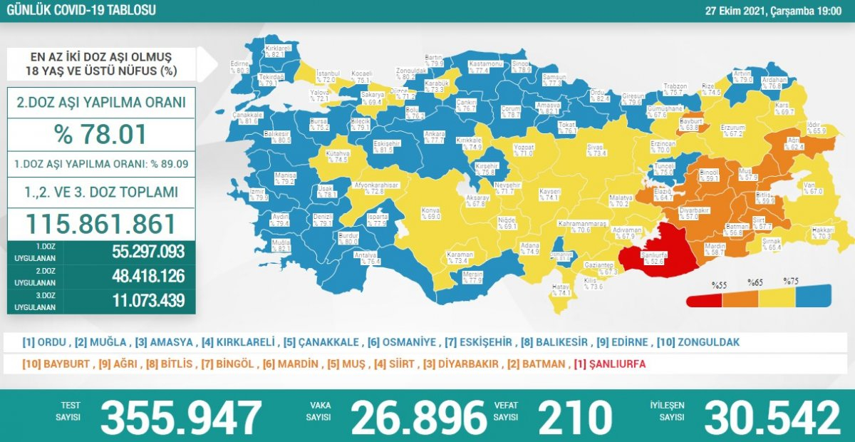 En az iki doz aşı yapılanların oranının en düşük olduğu iller ise Şanlıurfa, Batman, Diyarbakır, Siirt, Muş, Mardin, Bingöl, Bitlis, Ağrı ve Bayburt olarak sıralandı.