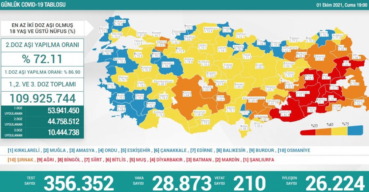 En az iki doz aşı yapılanların oranının en düşük olduğu iller ise Şanlıurfa, Mardin, Batman, Diyarbakır, Muş, Bitlis, Siirt, Bingöl, Ağrı ve Şırnak olarak sıralandı.