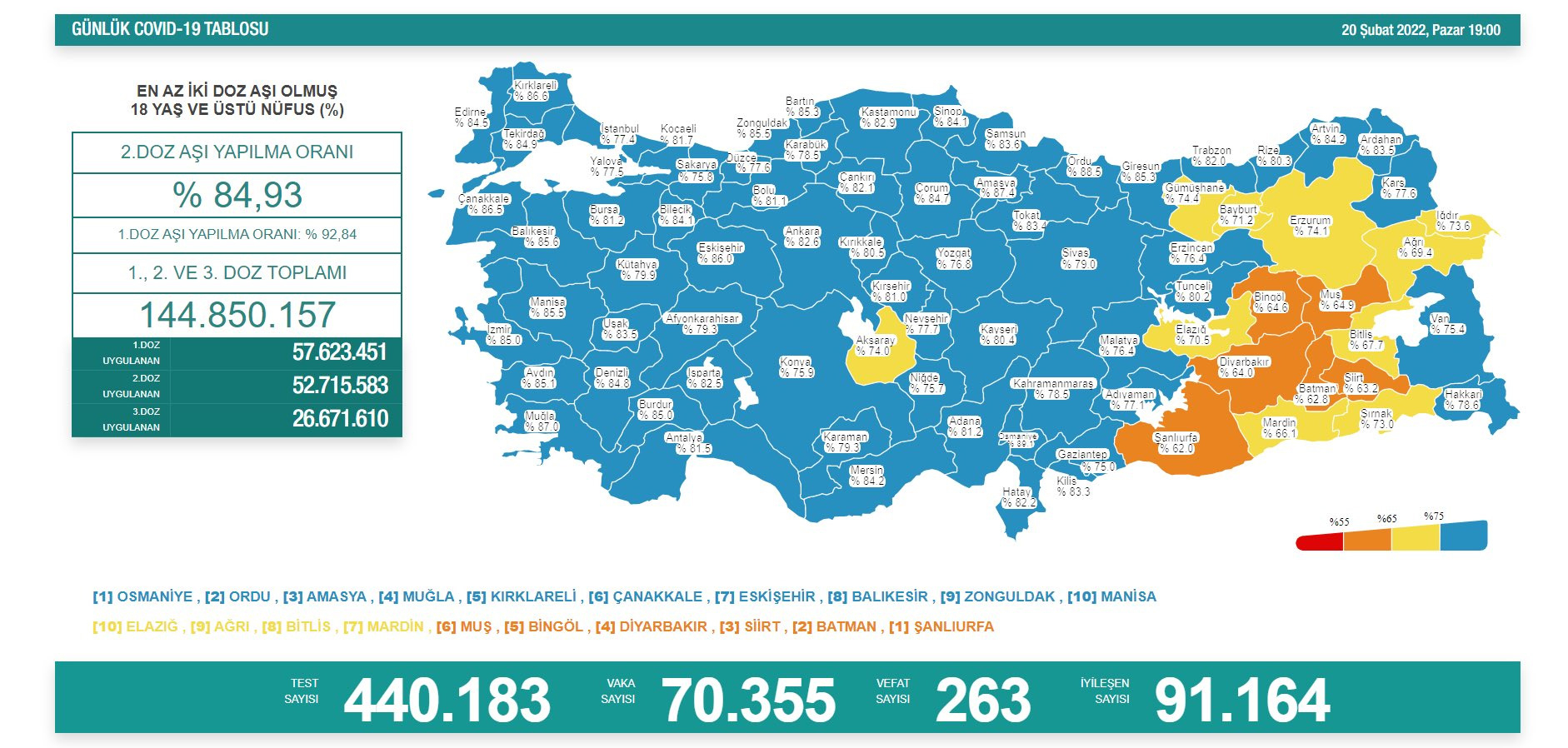 18 yaş ve üstü nüfusta en az iki doz aşı yaptıranların oranının en yüksek olduğu 10 il Osmaniye, Ordu, Amasya, Muğla, Kırklareli, Çanakkale, Eskişehir, Balıkesir, Zonguldak ve Manisa olarak belirlendi.
