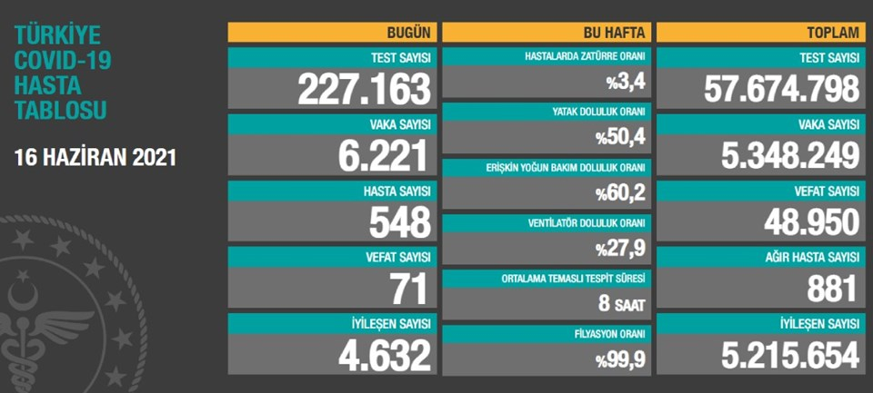 Türkiye'de corona virüsten son 24 saatte 71 can kaybı, 6 bin 221 yeni vaka 16 haziran 2021