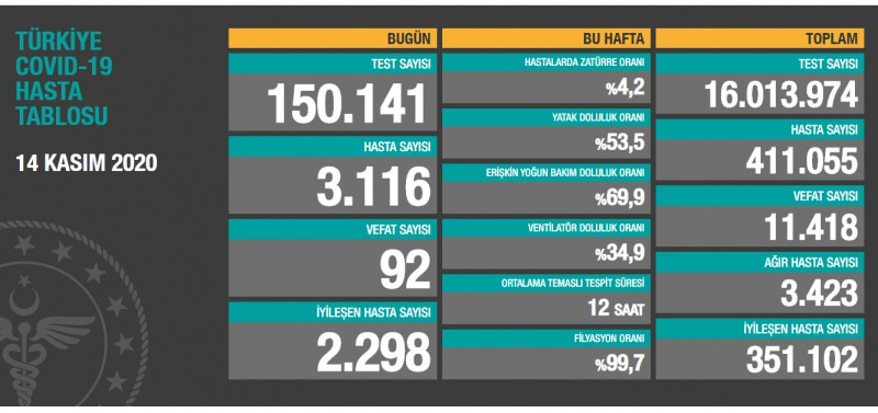 14 Kasım 2020 corona virüs tablosu açıklandı. Türkiye'de son 24 saatte 150 bin 141 Covid-19 testi yapıldı, 3 bin 116 kişiye hastalık tanısı konuldu, 92 kişi hayatını kaybetti.