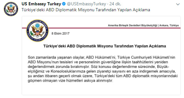 “Son zamanlarda yaşanan olaylar, Türk hükümetini, ABD hükümetinin Türk misyonlarının tesislerinin ve personelinin güvenliğine ilişkin taahhütlerini yeniden değerlendirmek zorunda bırakmıştır. Söz konusu değerlendirme sürecinde, ABD'deki büyükelçiliğimize ve başkonsolosluklarımıza gelen ziyaretçi sayısını en aza indirgemek amacıyla, şu andan itibaren geçerli olmak üzere, ABD'deki tüm misyonlarımızdaki ABD vatandaşlarına yönelik vize işlemleri askıya alınmıştır. Söz konusu uygulama etiket vizenin yanısıra e-Vize ve sınırda bandrol vize uygulamalarını da kapsamaktadır.”