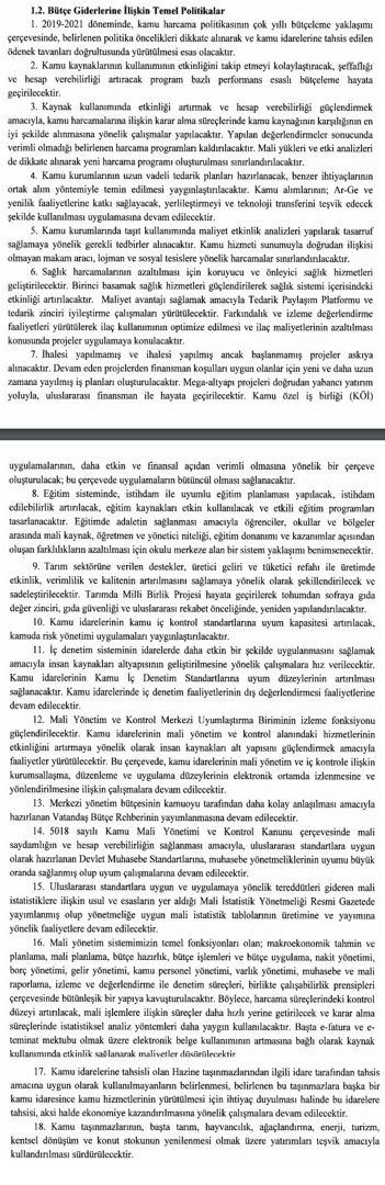 "Kamu yatırım harcamalarından azami düzeyde tasarruf edilirken kalkınma potansiyelini destekleyici mahiyetteki iktisadi ve sosyal altyapı yatırımlarına öncelik verilmeye devam edilecektir. Kamu kesimi yatırımları bütüncül bir yaklaşımla özel kesim yatırımlarını tamamlayacak şekilde tasarımlanacak ve hayata geçirilecektir. Kamu yatırım öncelikleri özel sektörün yenilikçi ve üretken yatırımlarını ve ticareti destekleyecek mahiyette belirlenecek; iş, üretim, yatırım ve yaşam ortamını iyileştiren nitelikli altyapı yatırımlarına öncelik verilecektir.