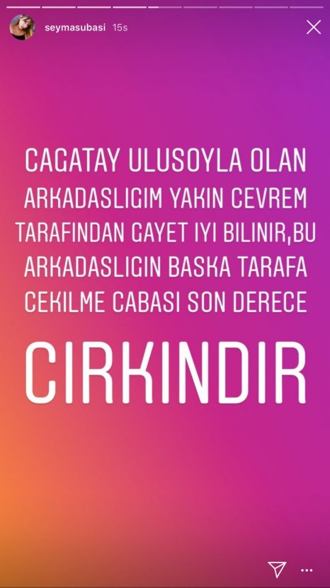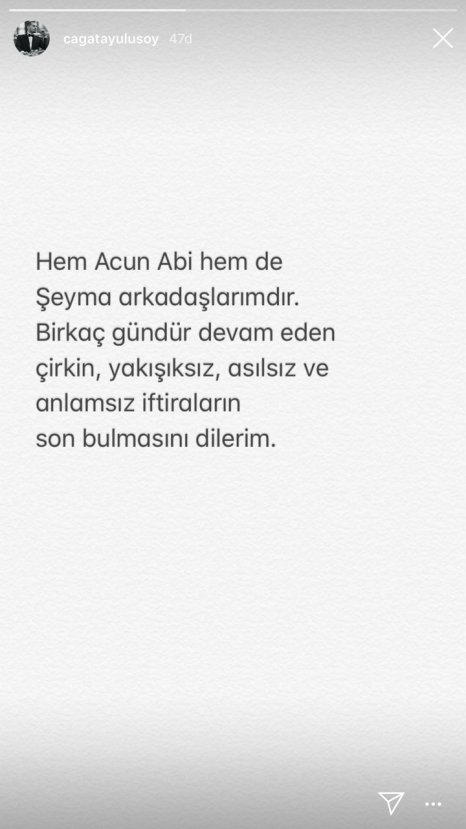 Çağatay Ulusoy, "Hem Acun abi hem de Şeyma arkadaşımdır. Birkaç gündür devam eden çirkin, yakışıksız, asılsız iftiraların son bulmasını dilerim" açıklamasında bulundu.