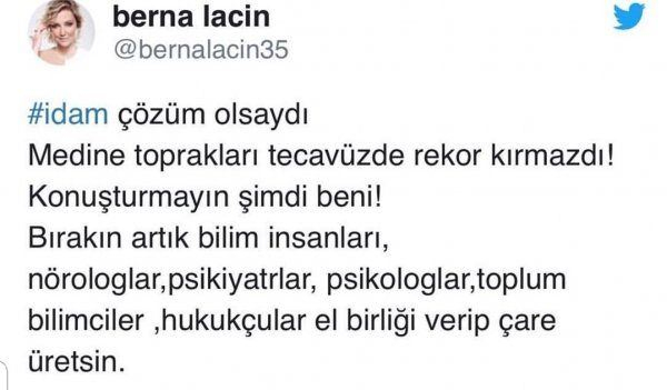Oyuncu Berna Laçin, cinsel istismar suçluları için istenen idam cezasına karşı çıkmış, "İdam çözüm olsaydı Medine toprakları tecavüzde rekor kırmazdı! Konuşturmayın şimdi beni! Bırakın artık bilim insanları, nörologlar,psikiyatrlar, psikologlar,toplum bilimciler ,hukukçular el birliği verip çare üretsin. Devlet, tribün sesleriyle toplum inşaa etmez!'' şeklinde tweet atmıştı.