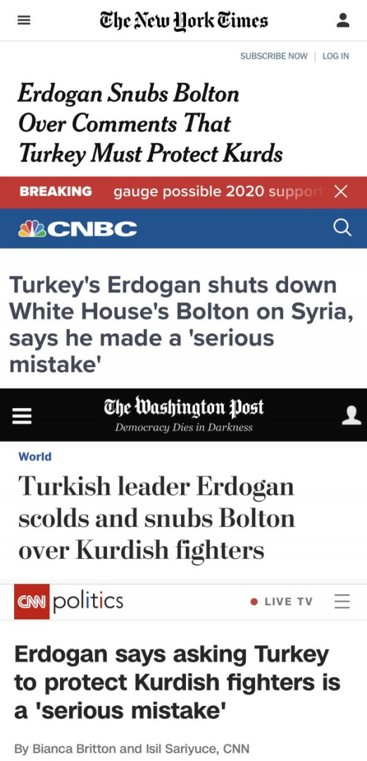 Bir diğer haber sitesi CNBC ise, "Erdoğan, Bolton'a Suriye konusunda kapıları kapattı." yorumunu yaptı.