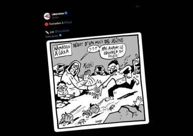 Fransa'nın Liberation gazetesi, 'Gazze'de Ramazan' karikatürüyle İsrail'in saldırıları altında hayatta kalma savaşı veren Gazzelilerin açlıkla mücadelesiyle dalga geçti.