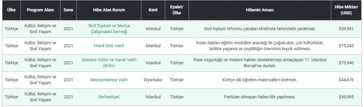 “Kürtçe dili öğretim materyalleri üretmek” için Mezopotamya Vakfı'na 44 bin dolar, “Partizan olmayan habercilik yapılması” için de Serbestiyet isimli medya kuruluşuna ise 49 bin 995 dolar aktardığını açıkladı.